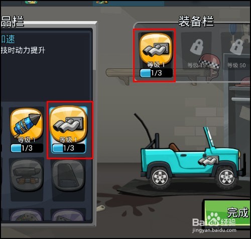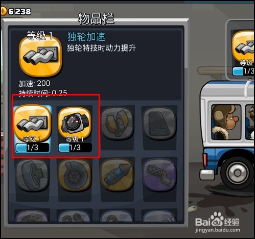 可以在装备栏中,装备物品,使车辆新能得以提高,等级越高,能装备的东西越多,如图所示