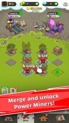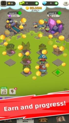 1、合并矿工来获得更强力的矿工,并逐渐解锁还未收集到的矿工图鉴。