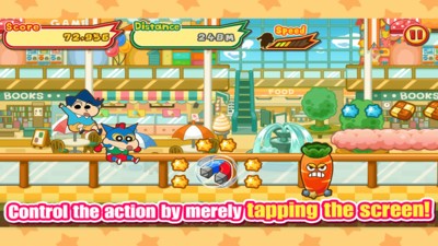 由于蜡笔小新大力飞奔向前,躲避障碍,通过点击屏幕收集糖果!