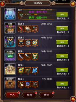 挑战强大的boss是获取神装的主要途径,通过个人boss,全民boss,转生boss获取海量的神装吧!