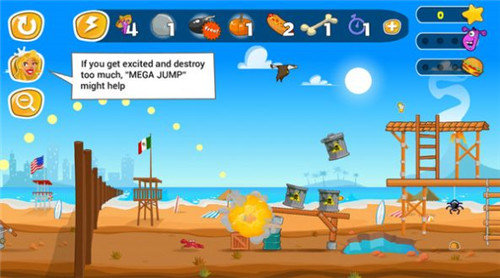 3、不断地弹射你的英雄吃掉所有出现的食物,为了趣味的逃脱躲避开障碍物消灭掉所有的武器。