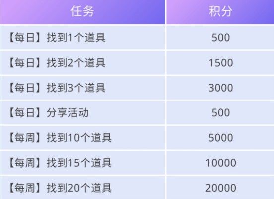 活动规则:在活动期间内,可进行寻物小游戏,本次活动共有9大主题,每日轮换,9天为一个周期,共计循环5个周期;每日更换3个道具与对应线索,共计135个道具,根据文字线索提示在图中寻找相应的物品,每日有3个目标物品,完成小游戏即可获得积分兑换奖励。