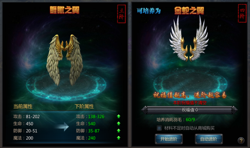 3.祝福值越高,升阶成功率就越高,当祝福值达到满值时,光翼进阶将100%成功。