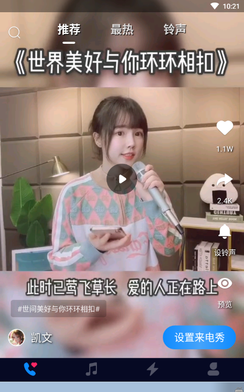 来电秀软件是一款视频来电铃声软件,拥有海量的来电视频资源,超全的视频分类,最新最热门的短视频这里应有尽有,每周都会更新最热门的来电视频,高清的视频与热门的铃声相结合,热门抖音神曲及时更新,快来设置属于你的个性来电秀吧。