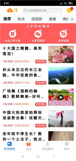 2、用户只要转发分享文章,就能轻松获取收益,另外自阅文章同样能够赚取收益,实在是打发时间的同时还能赚钱的利器。