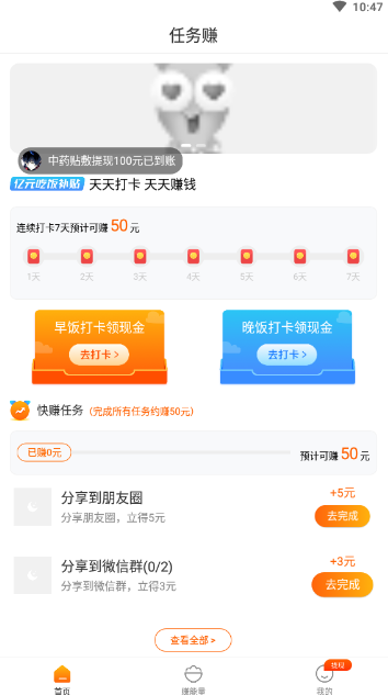 在吃饭赚,您每天吃饭打卡两次即可获得10元奖励。