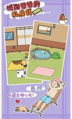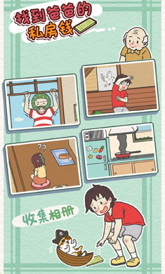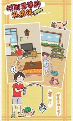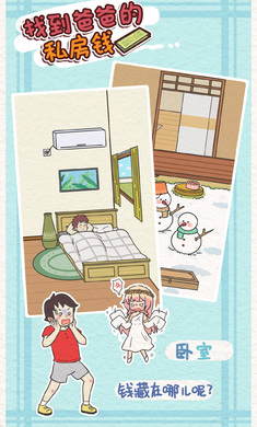 《找到爸爸的私房钱》是一款寻物解谜游戏,爸爸竟然背着妈妈偷偷藏了私房钱,还告诉妈妈没有藏钱。所以,本不该存在的钱被我花掉也是理所当然的吧。就让我们一起找到爸爸的私房钱,看他发现钱没了的有趣表情吧。