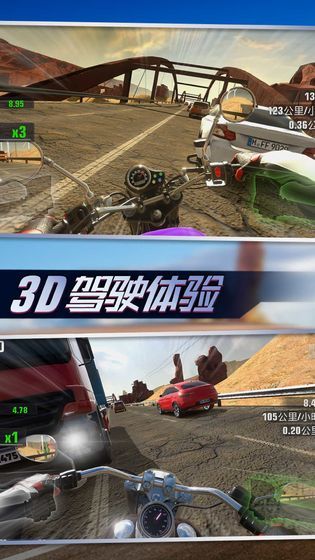 1、真实公路摩托锦标赛游戏采用了超3D设计,游戏画面精致无比,各种细腻的操作带来的收益也是巨大的。