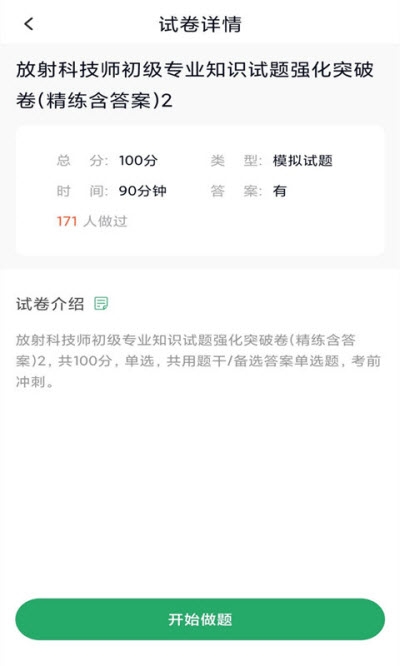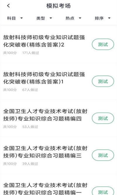 放射医学师题库APP有模拟考场、历年真题练习、每日一练、快速练习、考点练习、考试押题、做题记录等多种学习与做题模式、丰富多样化的陪你一起准备放射医学师考试。