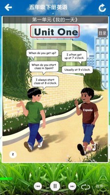 3、有高清的全彩电子课本(电子书),每页都配有高清的真人朗读,可重复播放,也可按次序播放。