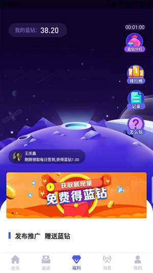 拥有蓝钻就能获得每日收益分红。用户可以在软件内分享广告到社交媒体
