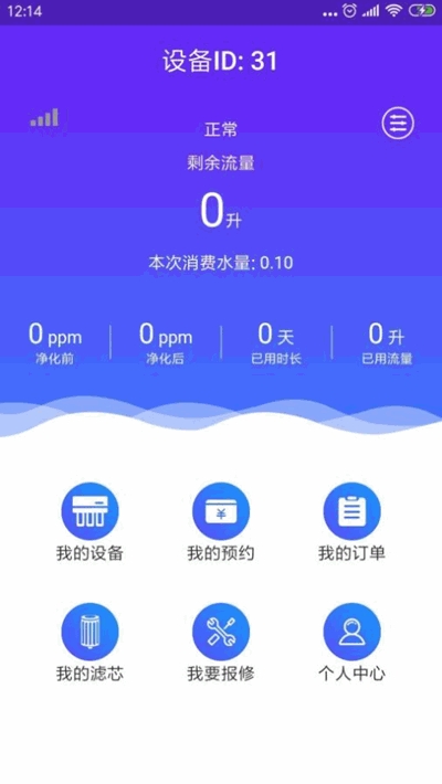 通过输入指定的设备id绑定已安装设备。查看设备的用水量、净化前、净化后的ppm值等信息,显示累计使用时长或流量。