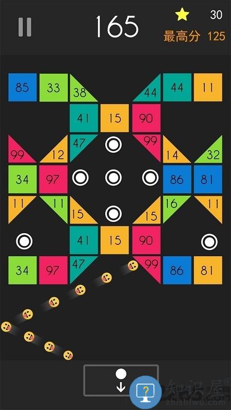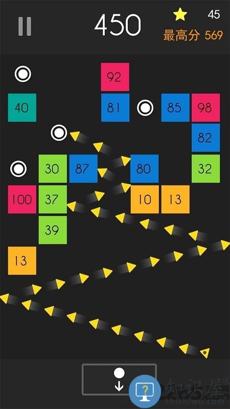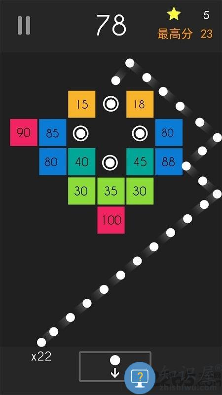 沿瞄准线弹射到屏幕中间带有各种数字的方块上,让圆球不断的在多个方块、墙壁之间来回反弹,直到圆球反弹到地面。当圆球与方块每碰撞一次,方块上的数字就会减少一,直到方块的数字变为零时,该方块就会消失掉。所有圆球回到地面后,上方的所有方块会往下移动一格,玩家需要选择发射时的瞄准路线,并计算反弹路线,力求让圆球在方块之间尽可能多的反弹,在方块移动到地面之前,尽快的消除掉屏幕中出现的方块。