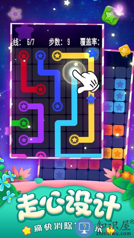 1.连消星星,通过滑动连接关卡内同颜色的星星,在步数和覆盖率的限制下,增加了玩家消除的紧张度和专注度