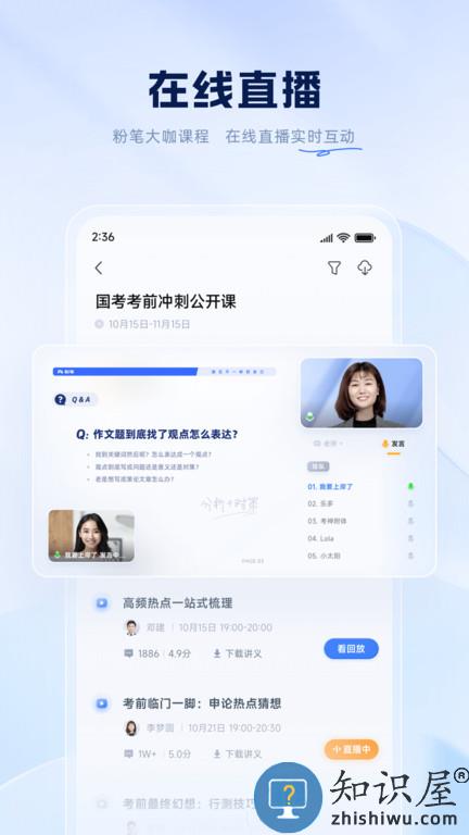 它是非常实用的学习互动软件。你可以在粉笔直播课上观看直播课,还可以实时互动聊天等等。现在包含公务员考试、国家司法考试、考研政治和考研英语等多门课程。