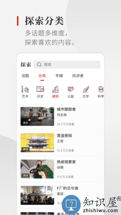 1. 增添「探索」模块,从“话题”、“分类”、“专辑”及“讲者”四个维度为用户提供探索内容的平台。