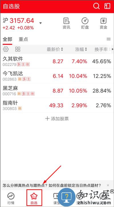 用户添加好的多支自选股,可点击首页下方【自选】查看到;