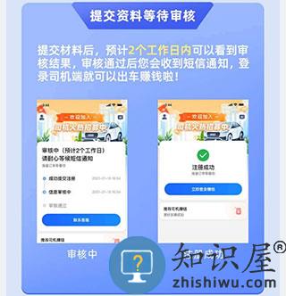 提交材料后,预计2个工作日内可以看到审核结果,审核通过后您会收到短信通知,登录司机端就可以出车赚钱啦