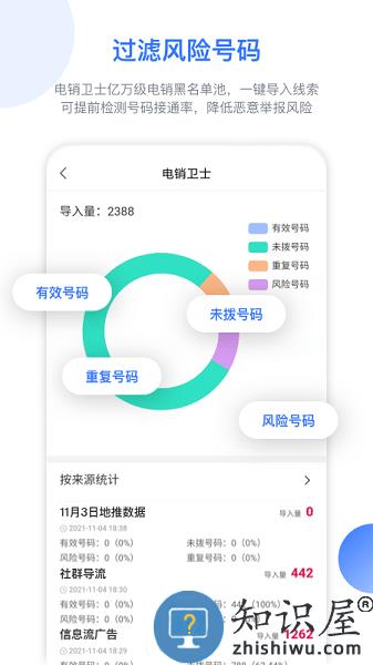连接腾讯管家、360及三大运营商去除恶意投诉、恶意标记等高风险号码,通过亿级大数据提前预知高质量线索,提高销售效率,降低封号标记。