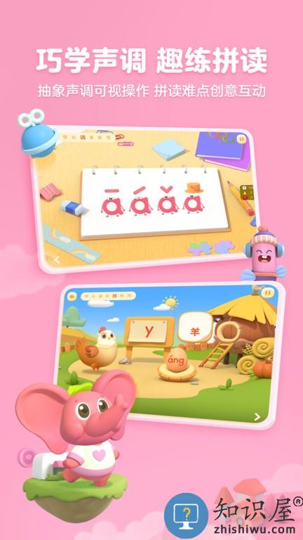 秉承科学原则,共分为预习、认形、声调、听音、跟读、练习、书写、测试等环节,让孩子学习拼音形状、发音、拼读、声调、书写等能力