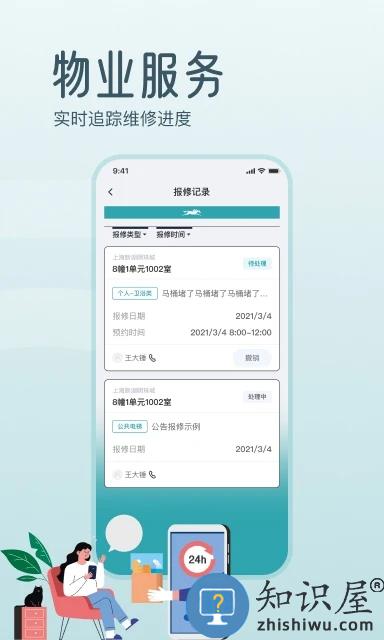 - 智慧报修:通过手机发起报事报修,并实时追踪报修进度,维修结束还支持服务打分。