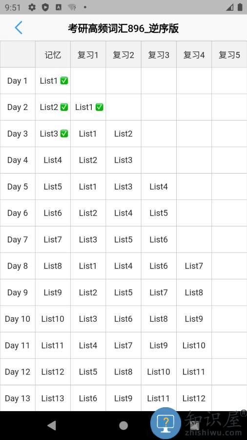 根据艾宾浩斯的记忆规律来使用,第一个Day记忆单词,后续的复习间隔周期,把单词词库平均分为`15`个list,在`30`个Days的时间里持续记忆和不断复习.