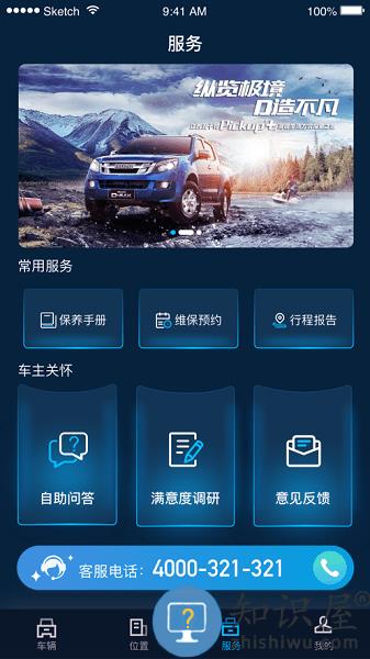 含维保预约、保养手册、行程报告、微客服、自助问答、满意度调研、意见反馈,呼叫客服等功能。
