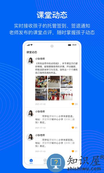 当日托管结束后,老师会对孩子的上课表现进行点评,并附上孩子的课堂照片,家长可以在app首页-校内-课堂动态查看,了解孩子的托管课堂情况。