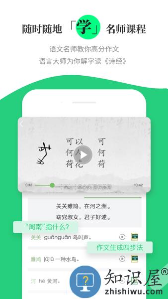 2.荟萃名家名师开发原创语言文字精品课程,提供综合性语言学习服务:北京师范大学王宁教授古代汉语团队开设《趣说汉字》音频课程,引经据典讲述汉字源流与文化;武汉大学万献初教授开设《解字读《诗经》》视频课程,解古通今、回归经典;北京师范大学第二附属中学语文特级教师何杰开设《高分作文课》视频课程,讲透规律授秘籍。支持文字、音频、视频多种学习模式,名师主讲,深入浅出。课程与工具书深度结合,每一节课重点标注知识点和疑难字词,难点一网打尽。
