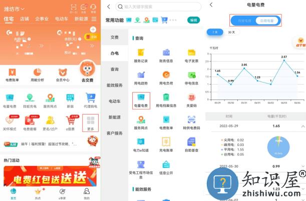 完成户号绑定后,点击首页-更多-电量电费,选择户号即可对月度电量和日用电量进行查询。