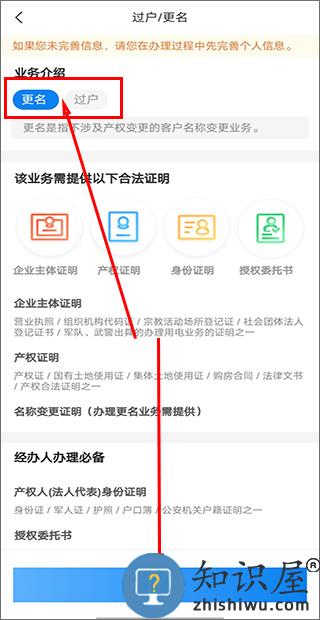 3、随后选择您需要办理的业务,更名和过户两种业务都需要用户提供企业主体证明、产权证明、身份证明、授权委托书等合法证明资料;