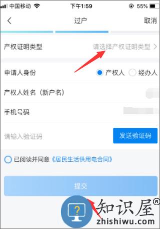 5、之后再选择自己的产权证明类型,使用手机号码接收并输入短信验证码,勾选合同信息,点击“提交”即可;