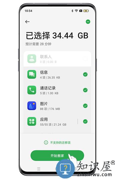 4、连接成功后,可选择将本机部分内容搬至新手机,或自定义搬家数据,点击“开始传输”即可。