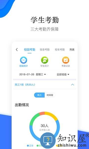 学生考勤管理:提供今日考勤管理,考勤记录管理、考勤统计(按班级和学生)功能;方便及时了解每班每生考勤情况;