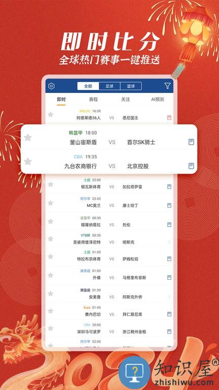 【即时比分】提供英超、西甲、法甲、德甲、中超、女足世界杯等足球赛事;NBA、CBA、欧洲各篮球比分播报等足球篮球探比分资讯,满足不同类型的体育爱好者;