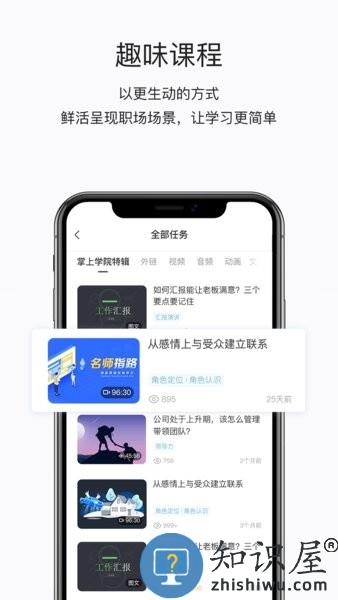 基于saas技术平台的移动学习产品,为企业提供“项目+内容+运营”的一体化移动学习综合解决方案;功能包括课程学习搜索:快速检索课程,即学即用主题:以问题为导向的汇编课程包,学员的知识宝囊栏目:独立制作人各施其才,吸引学员的连载节目闯关:从新手、熟手到高手的剧情游戏化闯关,高能助攻学员职场成长圈子:打造互动交流社区,提升学习效果,提高学员学习积极性资讯:了解的企业学习知识和资讯。