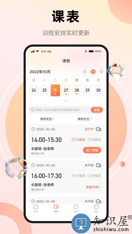 管乐团伴学端适合伴学教师用户来使用,可以在手机上查看学生的练习情况,乐团班级的训练进度一目了然,支持按照日历查看课表安排,能够进入课堂进行上课直播。