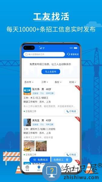 专注于建筑用工领域的招工找活APP,致力于打造线上建筑业劳务市场。它是一个智能高效的建筑招聘和工地找活的全国工友圈综合服务平台,为全国范围内的工友、班组长、工头提供精准匹配的信息,让招工找活变得简单高效。