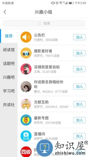 点击兴趣小组,查看各个兴趣小组的分类信息,加入小组进行讨论交流