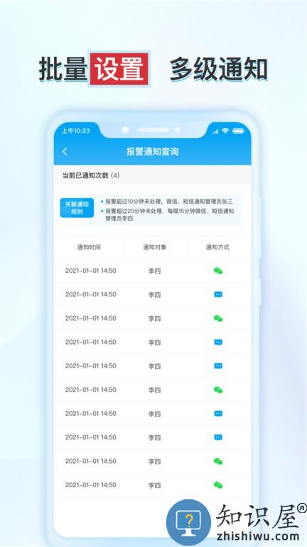 报警通知查询:还可以在线一键批量的报警处理,批量设置,多级通知