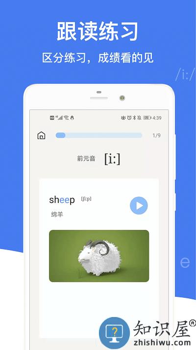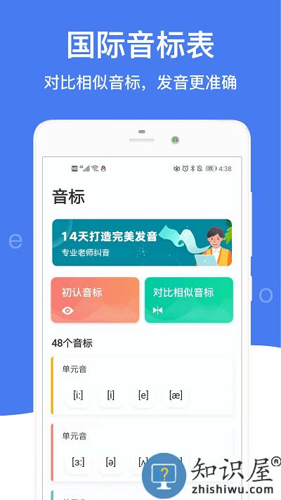 本应用让你零基础由浅入深学音标,并且通过语音评测技术帮助矫正你的发音。