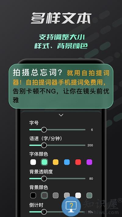 题词设置,支持字体大小、颜色、背景透明度、背景颜色的自定义设置,还可以在拍摄途中进行台本的快速更换
