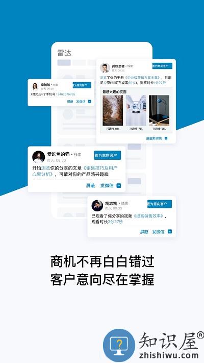 实时反馈名片、获客内容的浏览行为,谁看过你,看过什么,看了多久都能即时知道,实时跟进名片分享轨迹和转化效率,精准数据助力销售,判断与客户的亲疏远近