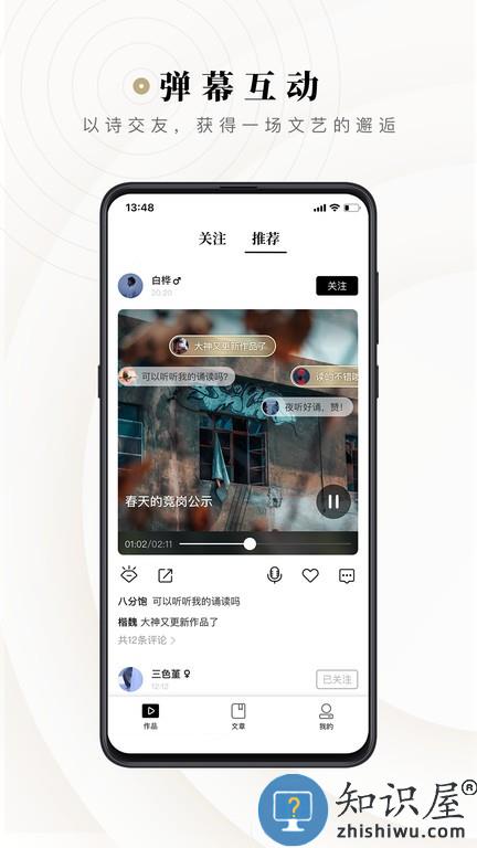 【交友互动】发布作品与更多爱好者一起交流,也可以将作品直接分享到微信、QQ中供大家欣赏."诗音"给你更舒适的朗读体验.