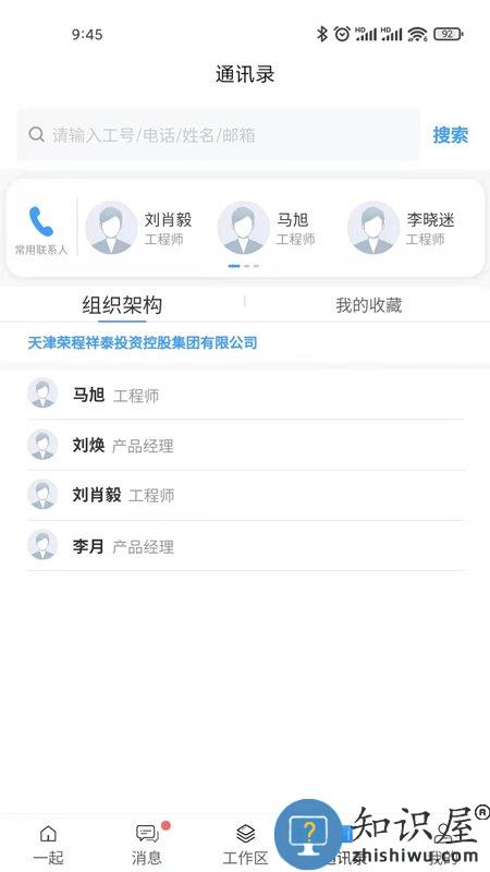 【通讯录】显示集团内部同事人员联系方式、部门以及岗位,可线上留言沟通