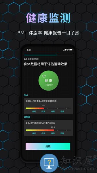 健康监测功能会根据您的身高、体重等信息智能计算BMI、体脂率等健康数据,为您生成详尽的健康报告,让您深入了解自己的健康状况,并为下一步的健身计划做好准备。