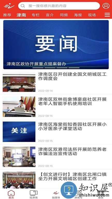 首页为新闻功能,位于底栏首位,为网民提供与津南区有关的新闻资讯。“首页”新闻版块细分为推荐、要闻、现场、公告、旅游、文化等6个子版块。
