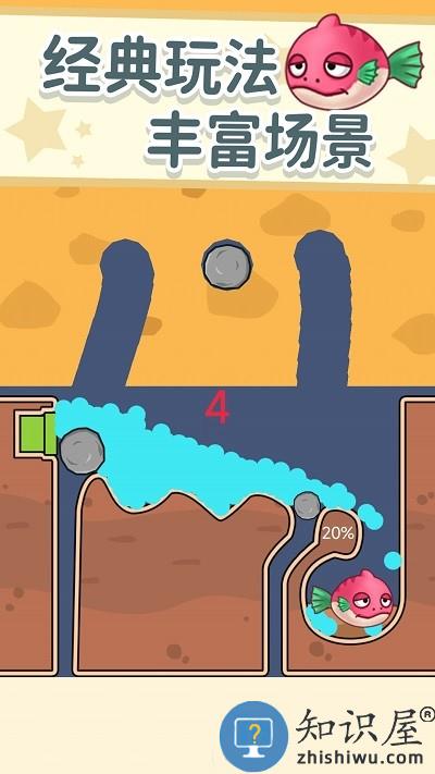 救救小鱼吧!一条小鱼掉到坑里了,滑动屏幕将沙子划开让石头滚动堵住缺口。只有这样水才能流动到小鱼那拯救他。这是一款趣味益智的休闲冒险闯关游戏。在游戏中玩家将在沙子中滑动创造道路,根据出水口的位置来规划正确的移动路线,让石头滚动到缺口处但是别堵住水流动哦!否则无法到达小鱼的坑里。