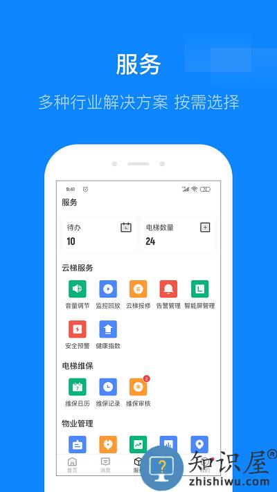 云梯设备服务:云梯报修、发布通知、音量调节;2265电梯维保服务:维保计划、维保记录增值服务:到家服务