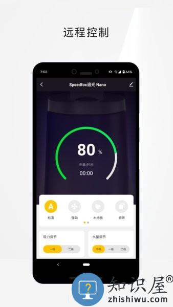 Speedfox nano追光智能洗地机app作为配套的手机控制工具,能够及时查看剩余的电量,可以控制强度,对于水量和吸力都能调节,不仅可以控制扫地和拖地,还能控制灯光的颜色和亮度。